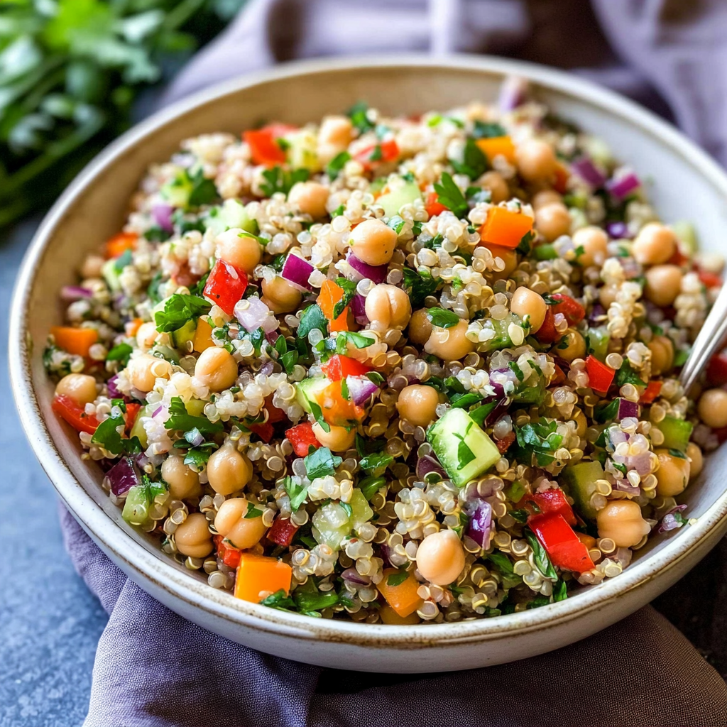 This Quinoa Chickpea Salad is a colorful and nutritious dish that combines protein-packed chickpeas with fluffy quinoa and a medley of fresh vegetables. Perfect for lunch, dinner, or as a side at gatherings, this salad bursts with flavor and offers a delightful crunch in every bite. With its vibrant ingredients and zesty lemon dressing, it’s not only easy to prepare but also ideal for meal prep. Whether served chilled on warm days or alongside grilled proteins, this salad will quickly become a favorite in your household.